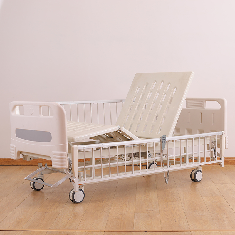 双功能电动医院床的特点包括整个床的可调高度,靠背和膝盖的调节,可调节的侧栏,以及易于操作床和附近其他电子设备的电子按钮。